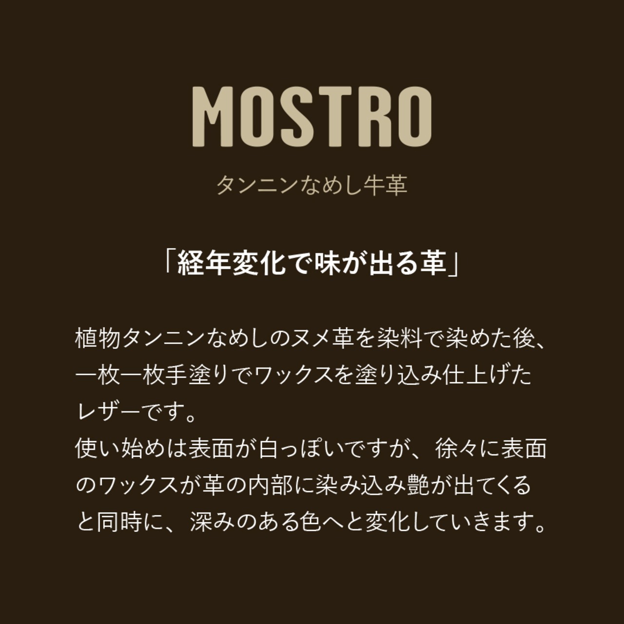 外側に使用している革(モストロ)は、植物タンニンでなめしたヌメ革を染料で染め、一枚ずつ手作業でワックスを塗り込んだレザーです。使い始めは白っぽい表情ですが、ワックスが内部に浸透するにつれ艶となめらかさが増し、経年で色が深まり唯一無二の風合いへと育ちます。