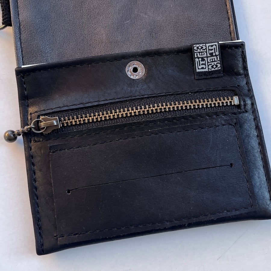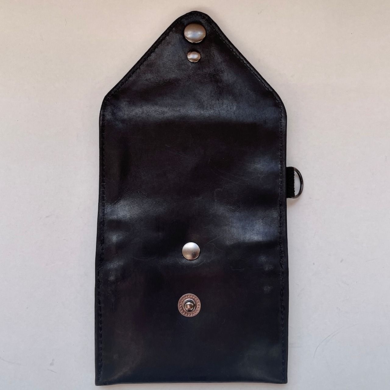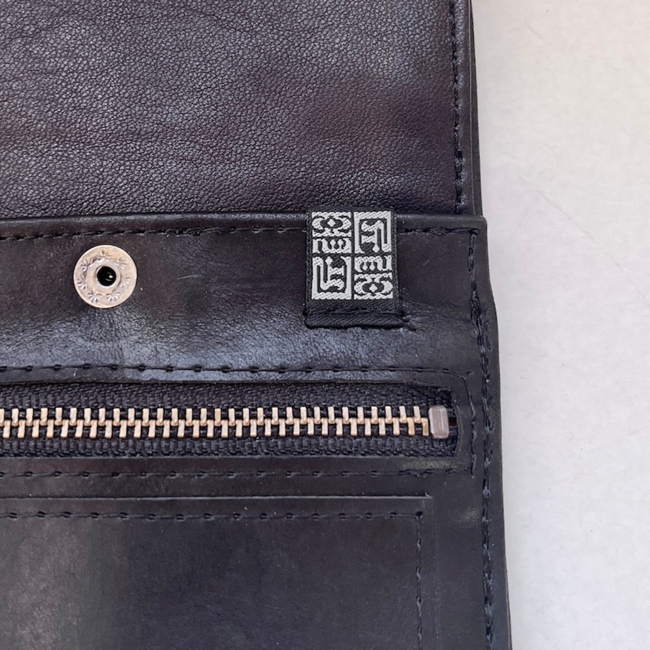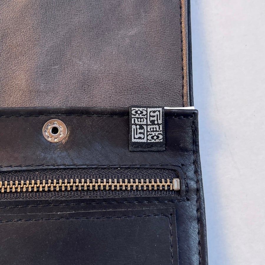 外側に使用している革(モストロ)は、植物タンニンでなめしたヌメ革を染料で染め、一枚ずつ手作業でワックスを塗り込んだレザーです。使い始めは白っぽい表情ですが、ワックスが内部に浸透するにつれ艶となめらかさが増し、経年で色が深まり唯一無二の風合いへと育ちます。