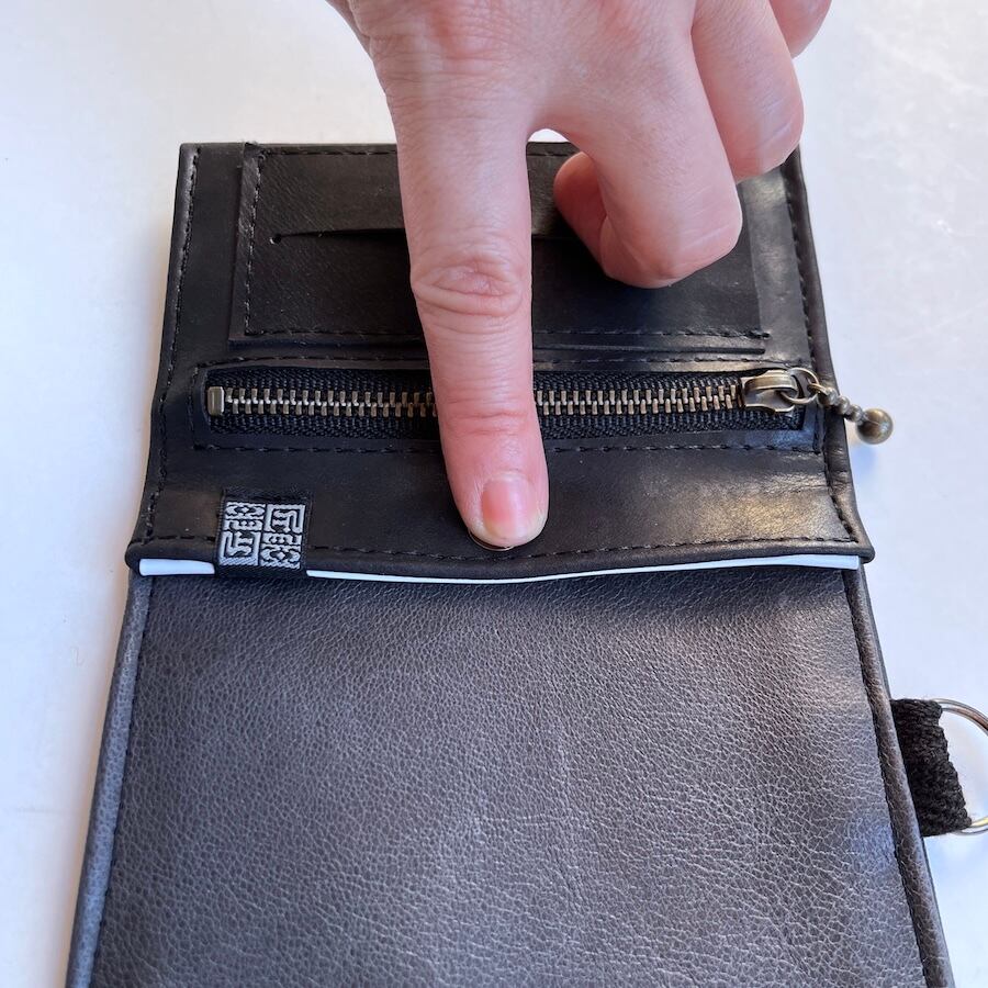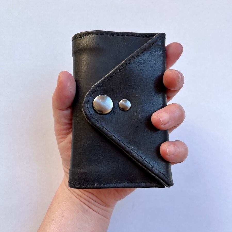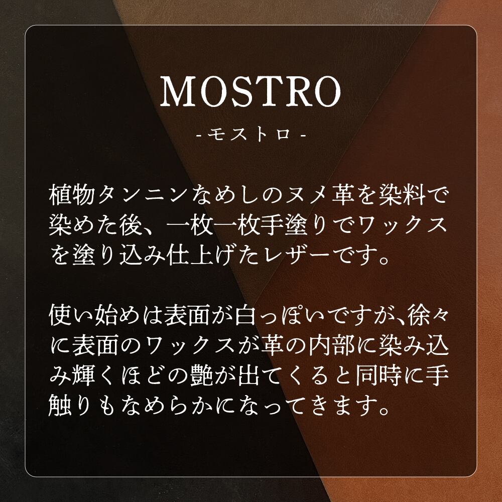 外側に使用しているモストロという革は、植物タンニンなめしのヌメ革を染料で染めた後、一枚一枚手塗りでワックスを塗り込み仕上げたレザーです。