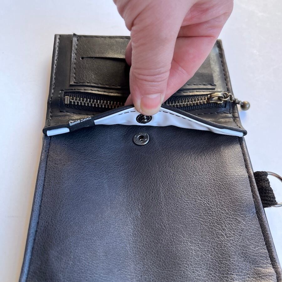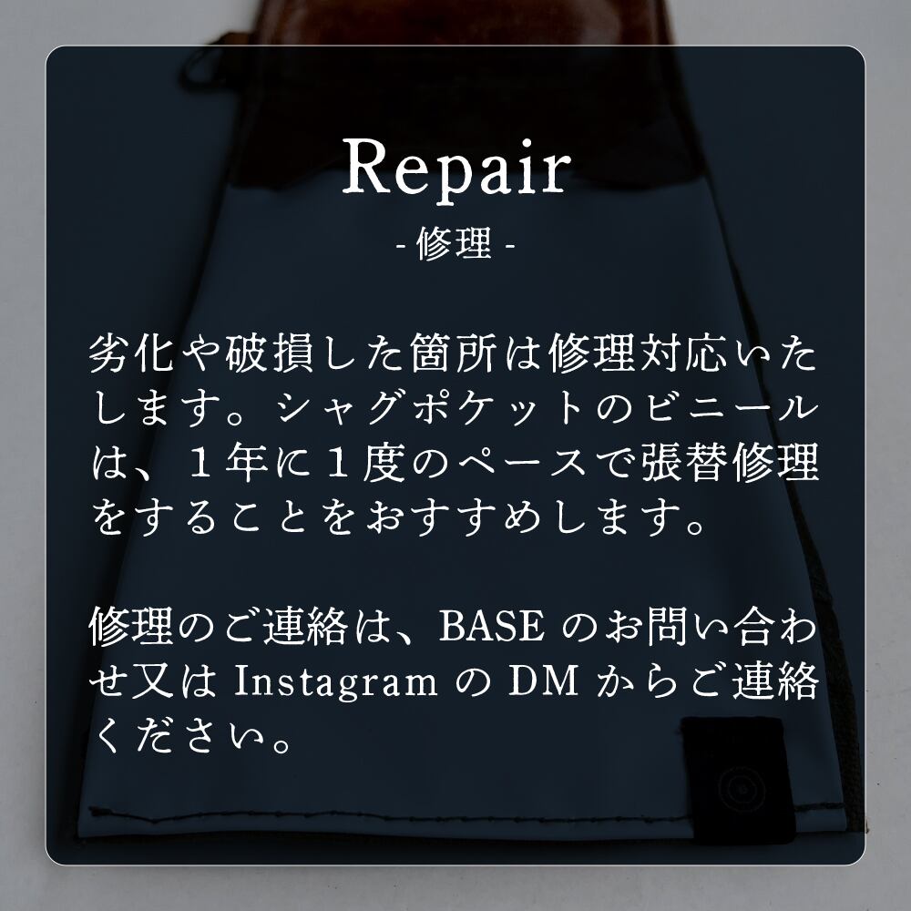 シャグポケットはビニール素材を使用しており、タバコの葉の乾燥を防ぎ革の色や匂い移りを防ぎます。(劣化の際はビニール張り替え修理が可能です)