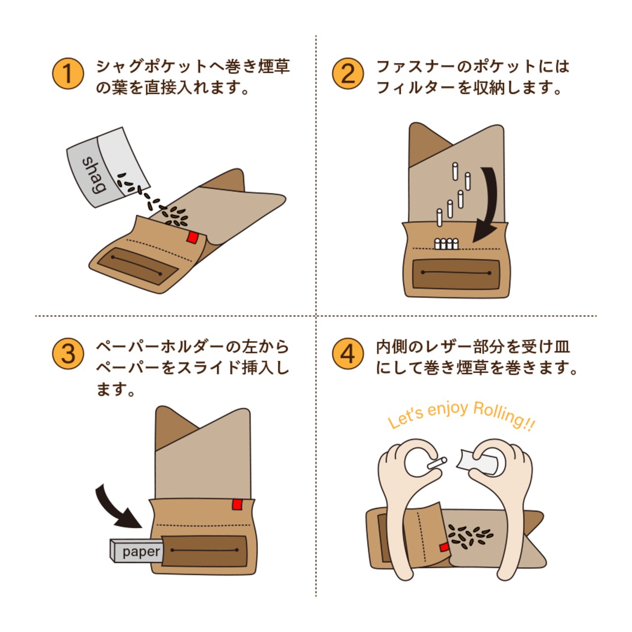 ④ 内側レザー部を受け皿にしてタバコを巻くことができます。