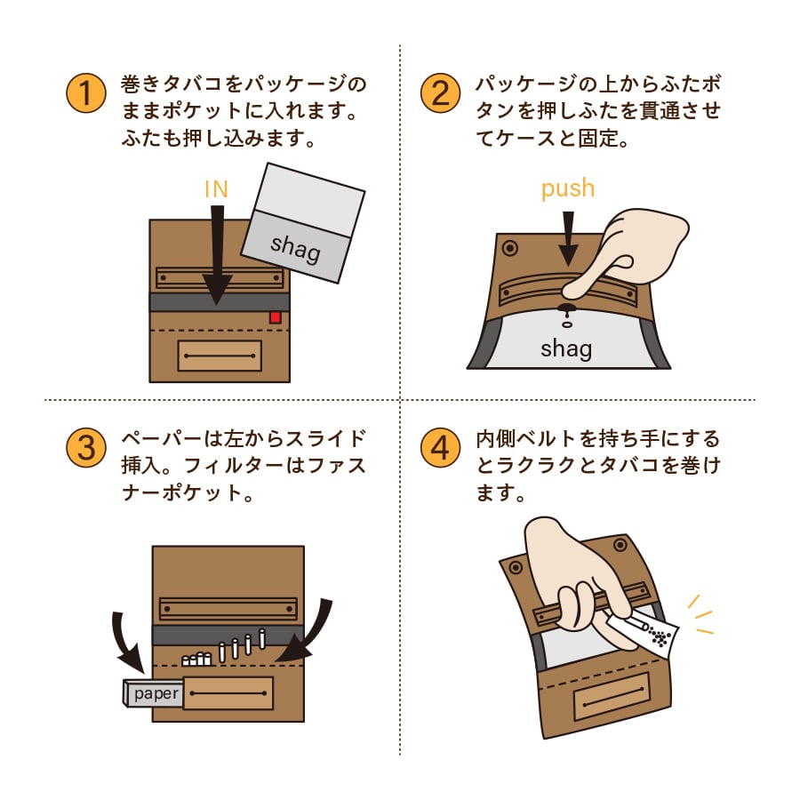 巻きタバコを「パッケージのまま」収納するケースです。内側のベルトを持ち手にすれば、テーブルがなくても立ったままでも巻きタバコを巻くことができ、とても便利です。