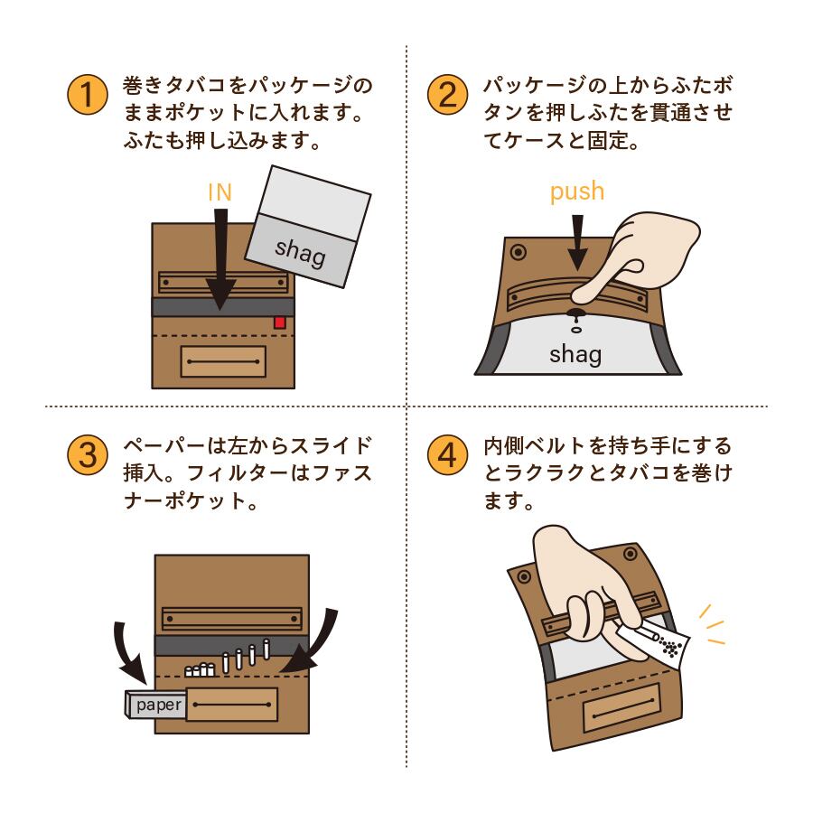巻きタバコを「パッケージのまま」収納するケースです。内側のベルトを持ち手にすれば、テーブルがなくても立ったままでも巻きタバコを巻くことができ、とても便利です。