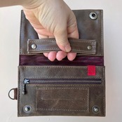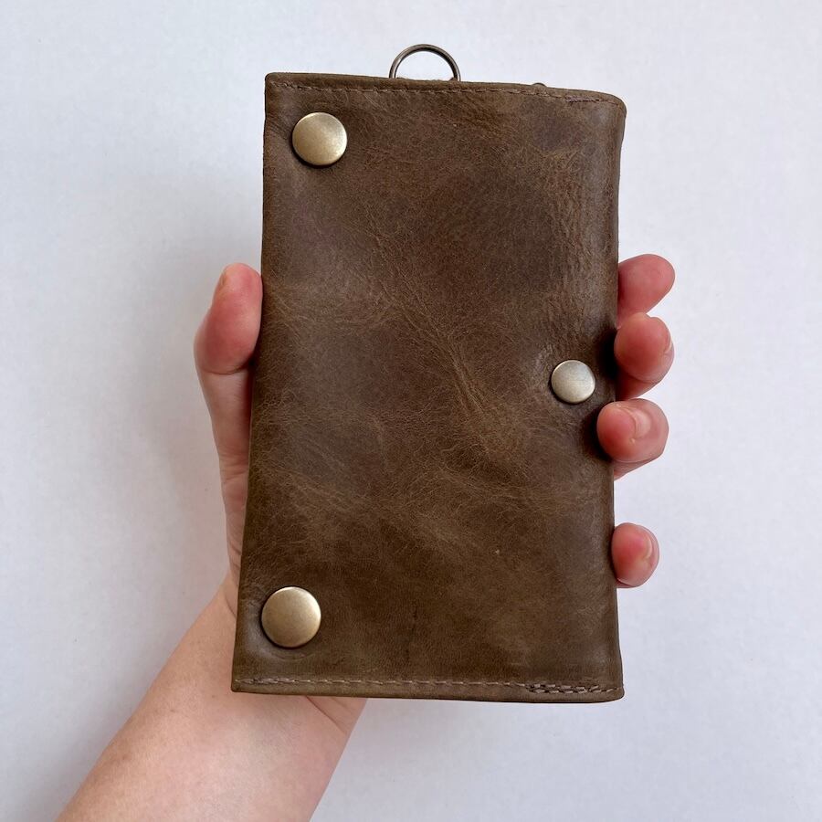 外側に使用しているモストロという革は、植物タンニンなめしのヌメ革を染料で染めた後、一枚一枚手塗りでワックスを塗り込み仕上げたレザーです。